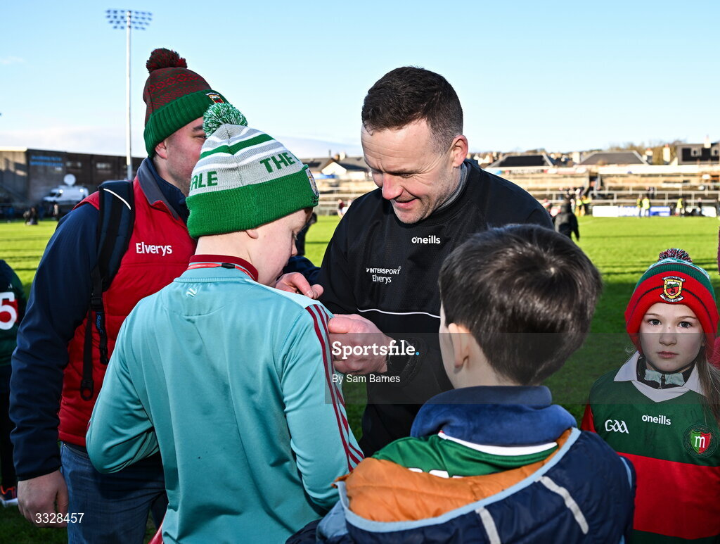25 January 2026; Mayo manager Andy Moran signs autographs after his side's victory in the Allianz Football League Division 1 match between Galway and Mayo at Pearse Stadium in Galway. Photo by Sam Barnes/Sportsfile
