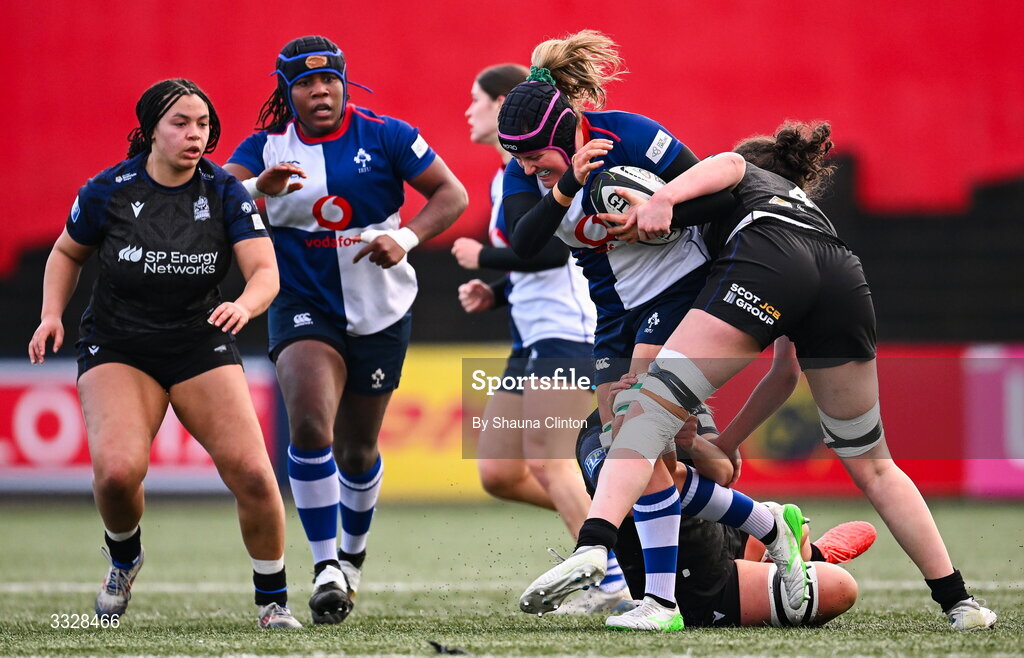 25 January 2026; Fiona Tuite of Wolfhounds is tackled by Holland Bogan of Glasgow Warriors during the Celtic Challenge Round 5 match between Wolfhounds and Glasgow Warriors at Virgin Media Park in Cork. Photo by Shauna Clinton/Sportsfile