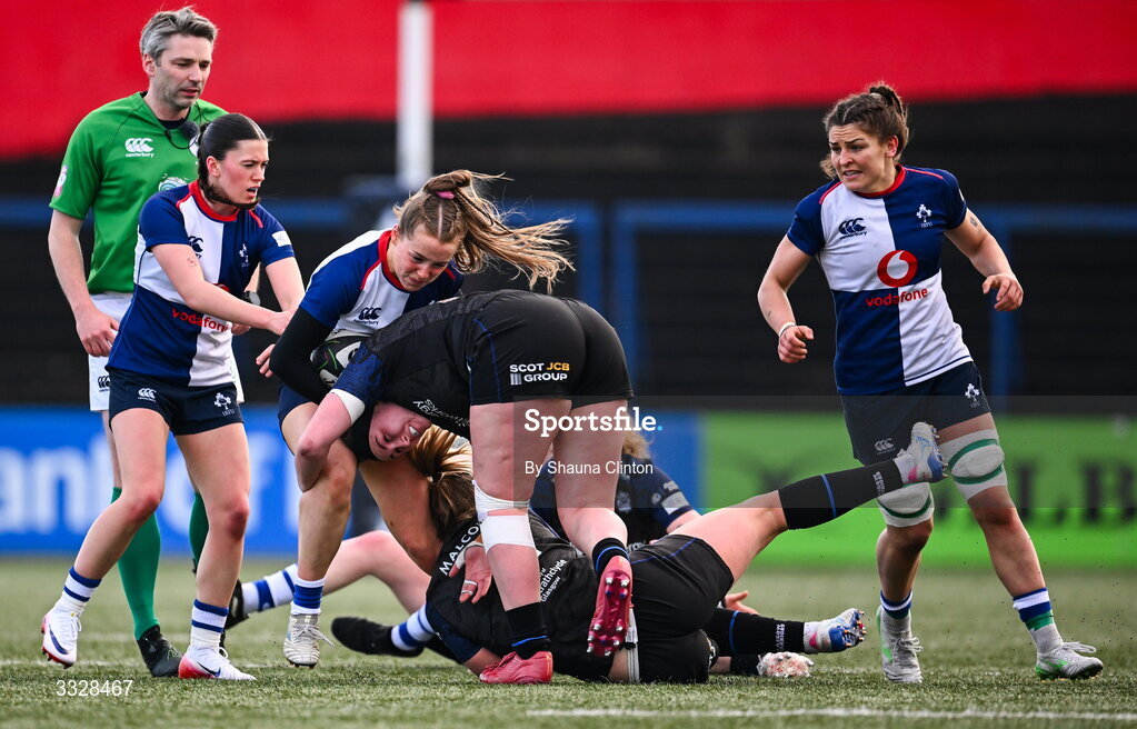 25 January 2026; Amy Larn of Wolfhounds is tackled by Beth Blacklock of Glasgow Warriors during the Celtic Challenge Round 5 match between Wolfhounds and Glasgow Warriors at Virgin Media Park in Cork. Photo by Shauna Clinton/Sportsfile