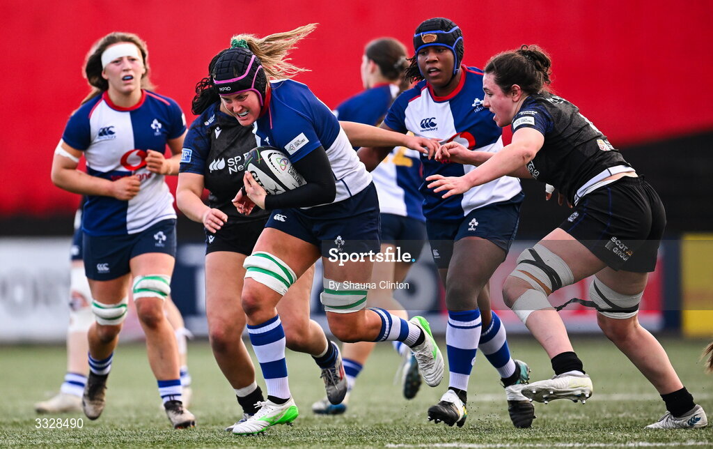 25 January 2026; Fiona Tuite of Wolfhounds makes a break during the Celtic Challenge Round 5 match between Wolfhounds and Glasgow Warriors at Virgin Media Park in Cork. Photo by Shauna Clinton/Sportsfile