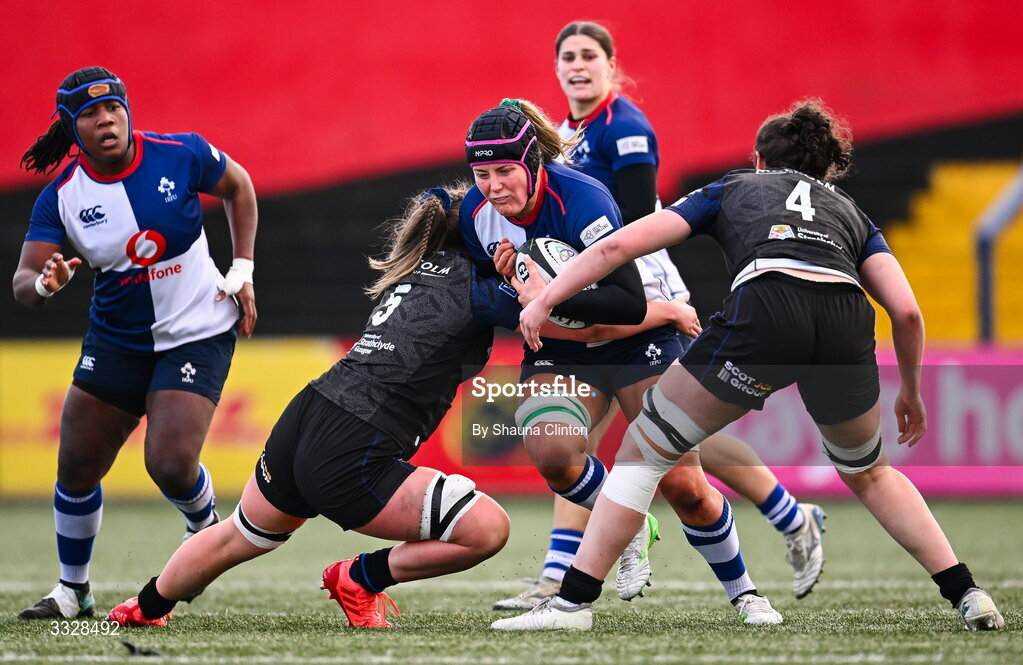 25 January 2026; Fiona Tuite of Wolfhounds in action against Glasgow Warriors players Freya Walker, left, and Holland Bogan during the Celtic Challenge Round 5 match between Wolfhounds and Glasgow Warriors at Virgin Media Park in Cork. Photo by Shauna Clinton/Sportsfile