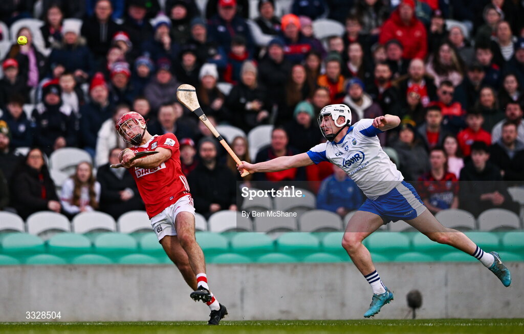 25 January 2026; William Buckley of Cork scores a point despite the attention of Shane Bennett of Waterford during the Allianz Hurling League Division 1A match between Cork and Waterford at SuperValu Páirc Uí Chaoimh in Cork. Photo by Ben McShane/Sportsfile