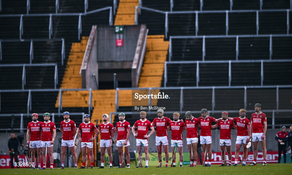 25 January 2026; Cork players stand for Amhrán na bhFiann before the Allianz Hurling League Division 1A match between Cork and Waterford at SuperValu Páirc Uí Chaoimh in Cork. Photo by Ben McShane/Sportsfile