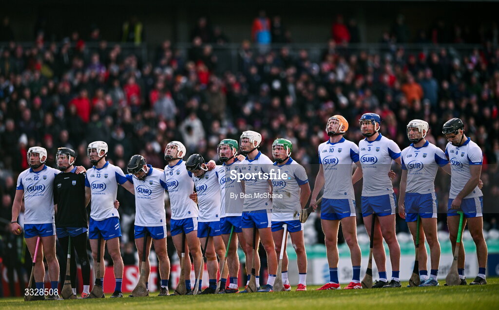 25 January 2026; Waterford players stand for Amhrán na bhFiann before the Allianz Hurling League Division 1A match between Cork and Waterford at SuperValu Páirc Uí Chaoimh in Cork. Photo by Ben McShane/Sportsfile