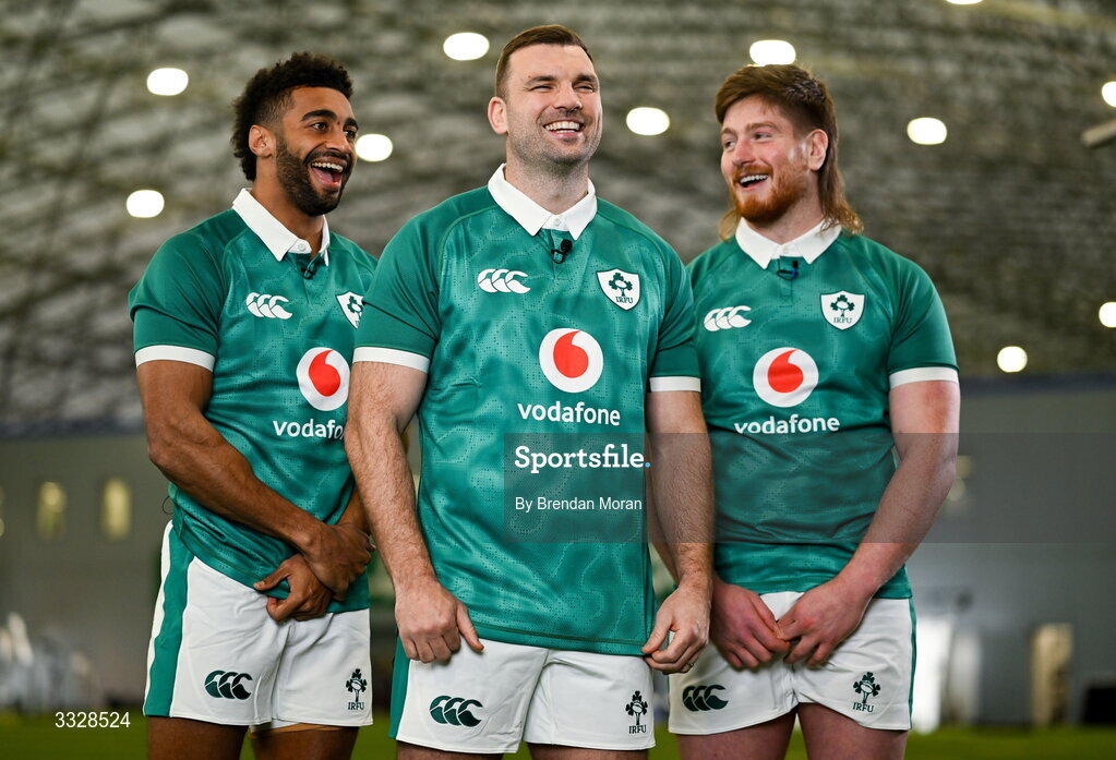 25 January 2026; Robert Baloucoune, left, Tadhg Beirne and Joe McCarthy during the Ireland team assembly day at the IRFU High Performance Centre in Dublin ahead of the 2026 Guinness Six Nations Rugby Championship. Photo by Brendan Moran/Sportsfile