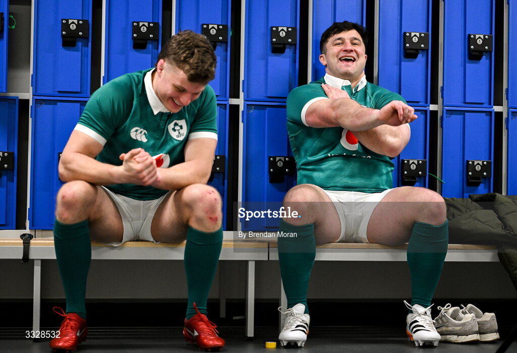 25 January 2026; Cian Prendergast, left, and Thomas Clarkson during the Ireland team assembly day at the IRFU High Performance Centre in Dublin ahead of the 2026 Guinness Six Nations Rugby Championship. Photo by Brendan Moran/Sportsfile
