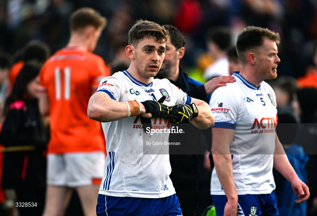 25 January 2026; A dejected Mícheál Bannigan of Monaghan after the Allianz Football League Division 1 match between Monaghan and Armagh at St. Tiernach's Park in Clones, Monaghan. Photo by Daire Brennan/Sportsfile