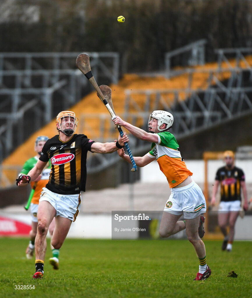 25 January 2026; Shane Murphy of Kilkenny is tackled by Brecon Kavanagh of Offaly during the Allianz Hurling League Division 1A match between Kilkenny and Offaly at UPMC Nowlan Park in Kilkenny. Photo by Jamie O'Brien/Sportsfile