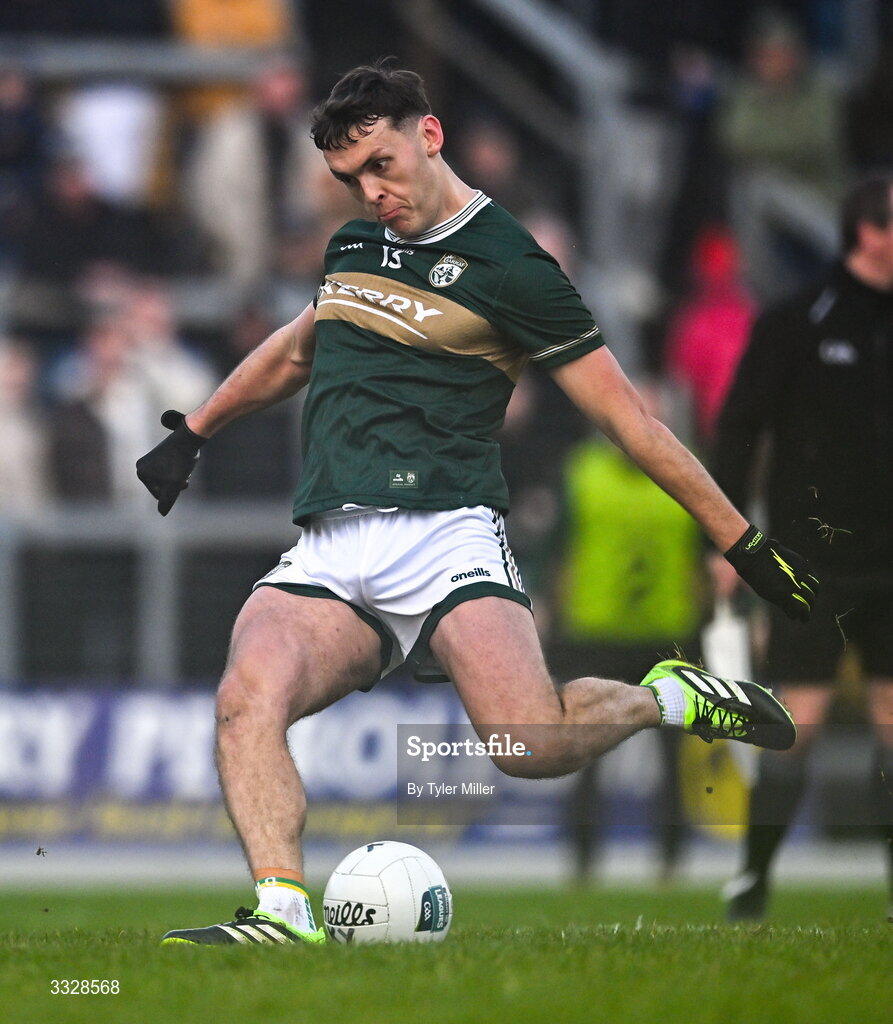 25 January 2026; David Clifford of Kerry shoots to score his side's second goal, a penalty, during the Allianz Football League Division 1 match between Kerry and Roscommon at Fitzgerald Stadium in Killarney, Kerry. Photo by Tyler Miller/Sportsfile