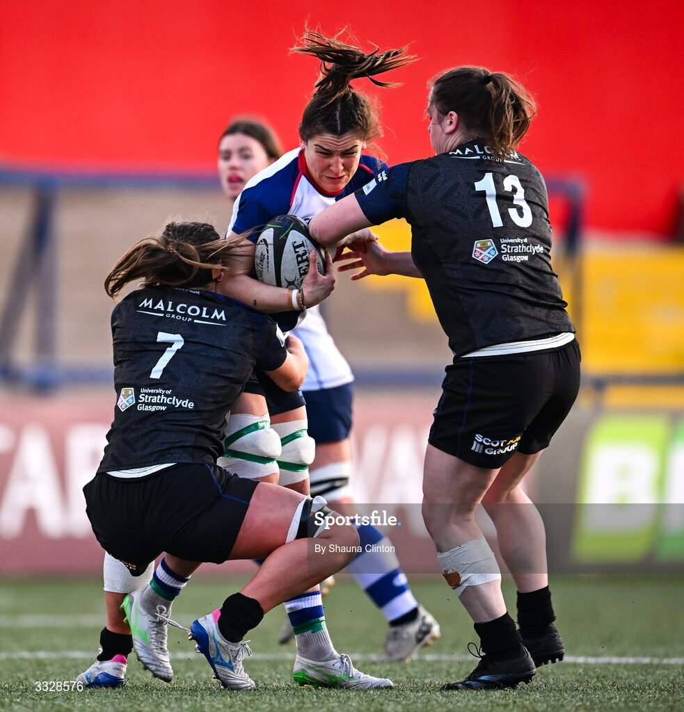 25 January 2026; Erin King of Wolfhounds in action against Glasgow Warriors players Gemma Bell, left, and Briar McNamara during the Celtic Challenge Round 5 match between Wolfhounds and Glasgow Warriors at Virgin Media Park in Cork. Photo by Shauna Clinton/Sportsfile