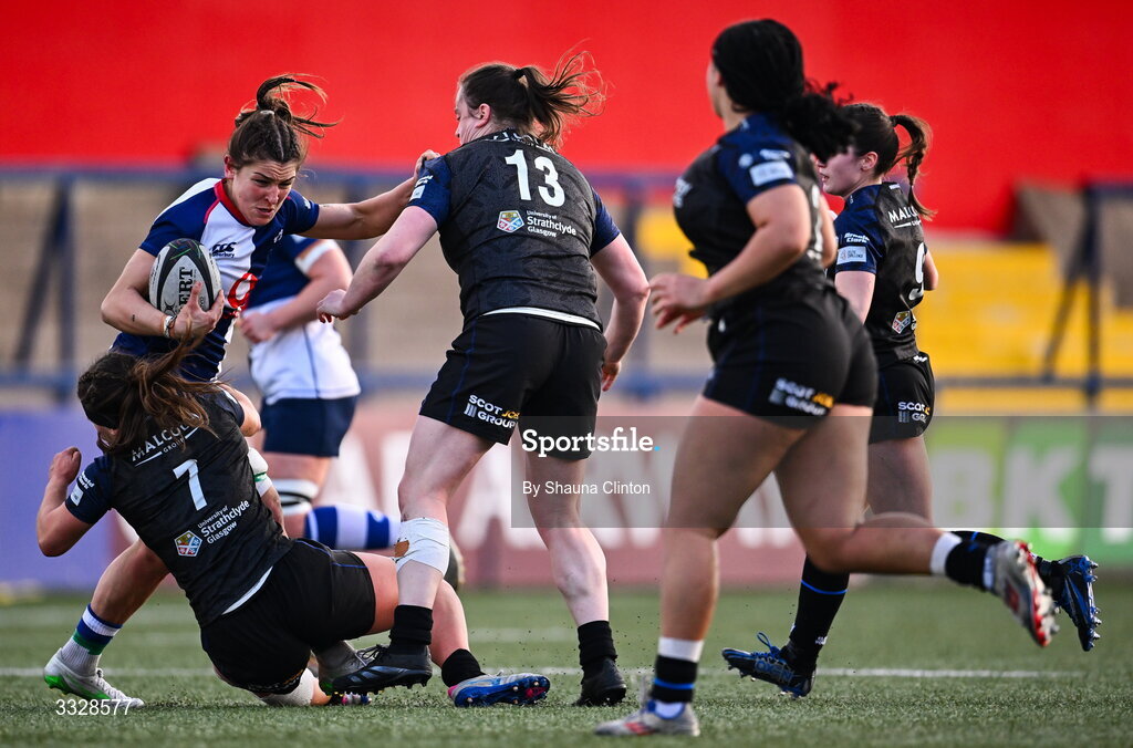25 January 2026; Erin King of Wolfhounds in action against Glasgow Warriors players Gemma Bell, left, and Briar McNamara during the Celtic Challenge Round 5 match between Wolfhounds and Glasgow Warriors at Virgin Media Park in Cork. Photo by Shauna Clinton/Sportsfile