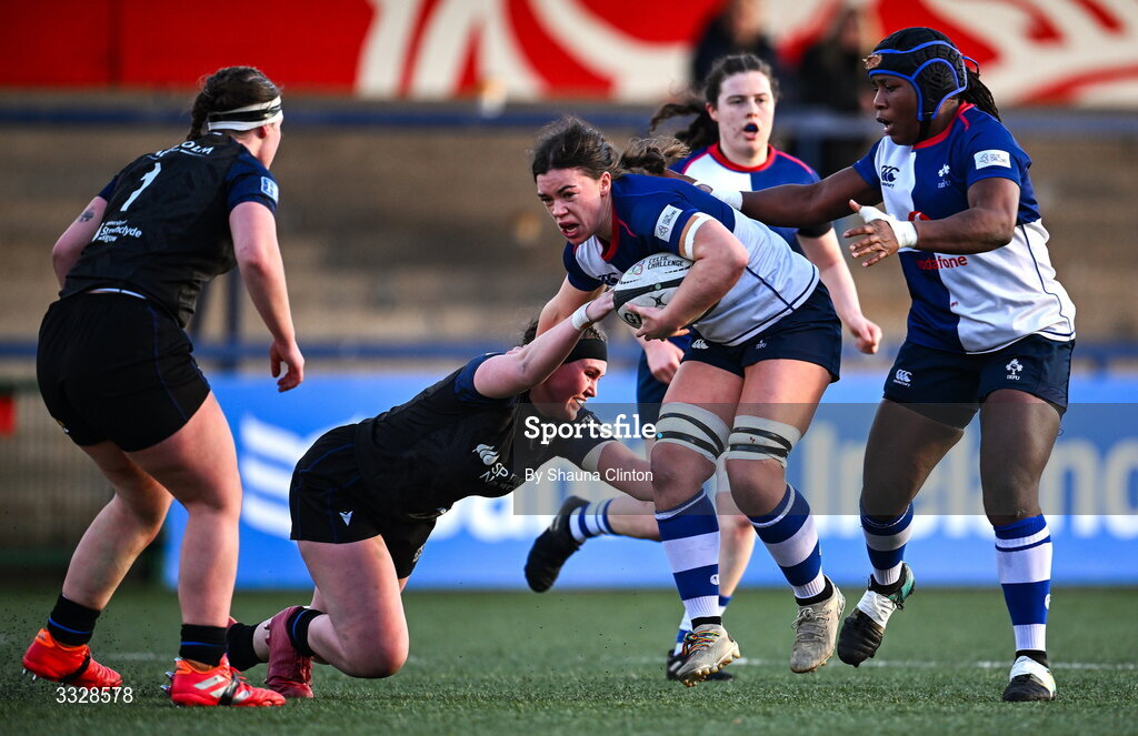 25 January 2026; Maeve Óg O'Leary of Wolfhounds evades the tackle of Imogen Spence of Glasgow Warriors during the Celtic Challenge Round 5 match between Wolfhounds and Glasgow Warriors at Virgin Media Park in Cork. Photo by Shauna Clinton/Sportsfile