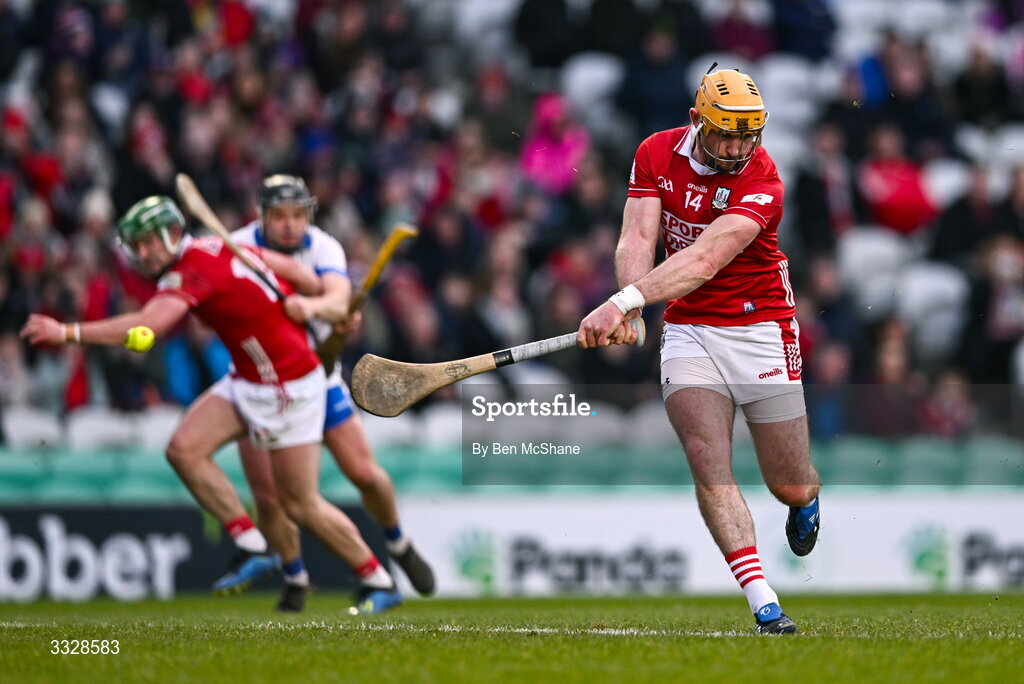 25 January 2026; Declan Dalton of Cork scores his side's second goal, a penalty, during the Allianz Hurling League Division 1A match between Cork and Waterford at SuperValu Páirc Uí Chaoimh in Cork. Photo by Ben McShane/Sportsfile