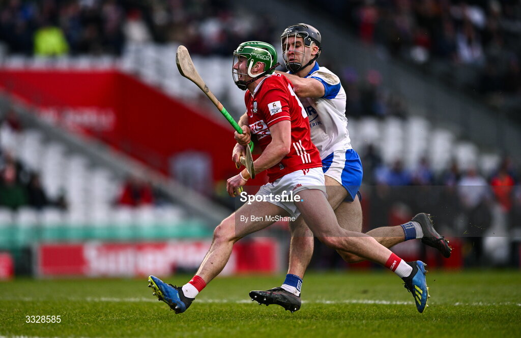 25 January 2026; Brian Roche of Cork is tackled by Mark Fitzgerald of Waterford during the Allianz Hurling League Division 1A match between Cork and Waterford at SuperValu Páirc Uí Chaoimh in Cork. Photo by Ben McShane/Sportsfile