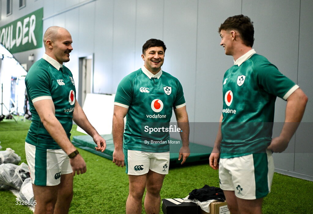 25 January 2026; Jacob Stockdale, left, Thomas Clarkson and Darragh Murray during the Ireland team assembly day at the IRFU High Performance Centre in Dublin ahead of the 2026 Guinness Six Nations Rugby Championship. Photo by Brendan Moran/Sportsfile