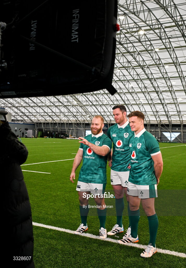 25 January 2026; Jeremy Loughman, left, James Ryan and Josh van der Flier during the Ireland team assembly day at the IRFU High Performance Centre in Dublin ahead of the 2026 Guinness Six Nations Rugby Championship. Photo by Brendan Moran/Sportsfile