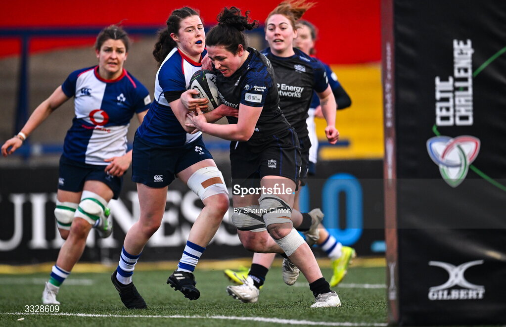 25 January 2026; Holland Bogan of Glasgow Warriors scores her side's first try during the Celtic Challenge Round 5 match between Wolfhounds and Glasgow Warriors at Virgin Media Park in Cork. Photo by Shauna Clinton/Sportsfile