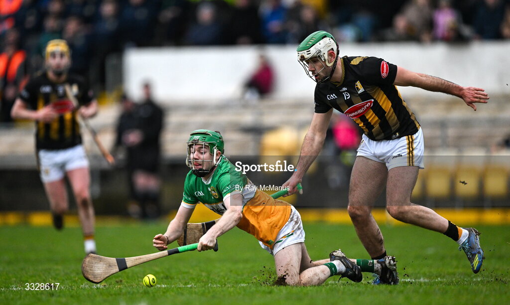 25 January 2026; Adam Screeney of Offaly is tackled by Paddy Deegan of Kilkenny during the Allianz Hurling League Division 1A match between Kilkenny and Offaly at UPMC Nowlan Park in Kilkenny. Photo by Ray McManus/Sportsfile