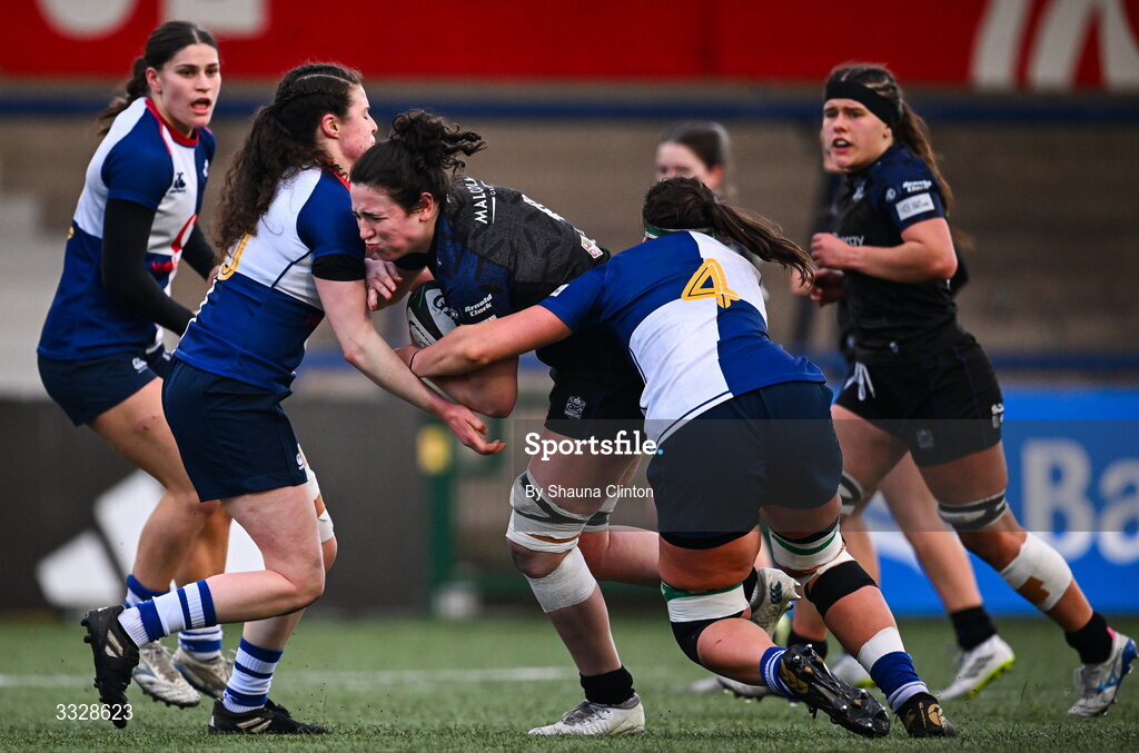 25 January 2026; Holland Bogan of Glasgow Warriors is tackled by Kate Jordan of Wolfhounds during the Celtic Challenge Round 5 match between Wolfhounds and Glasgow Warriors at Virgin Media Park in Cork. Photo by Shauna Clinton/Sportsfile