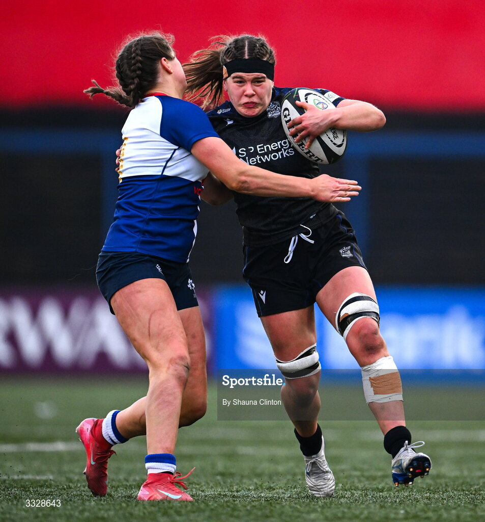 25 January 2026; Gemma Bell of Glasgow Warriors in action against Katie Corrigan of Wolfhounds during the Celtic Challenge Round 5 match between Wolfhounds and Glasgow Warriors at Virgin Media Park in Cork. Photo by Shauna Clinton/Sportsfile