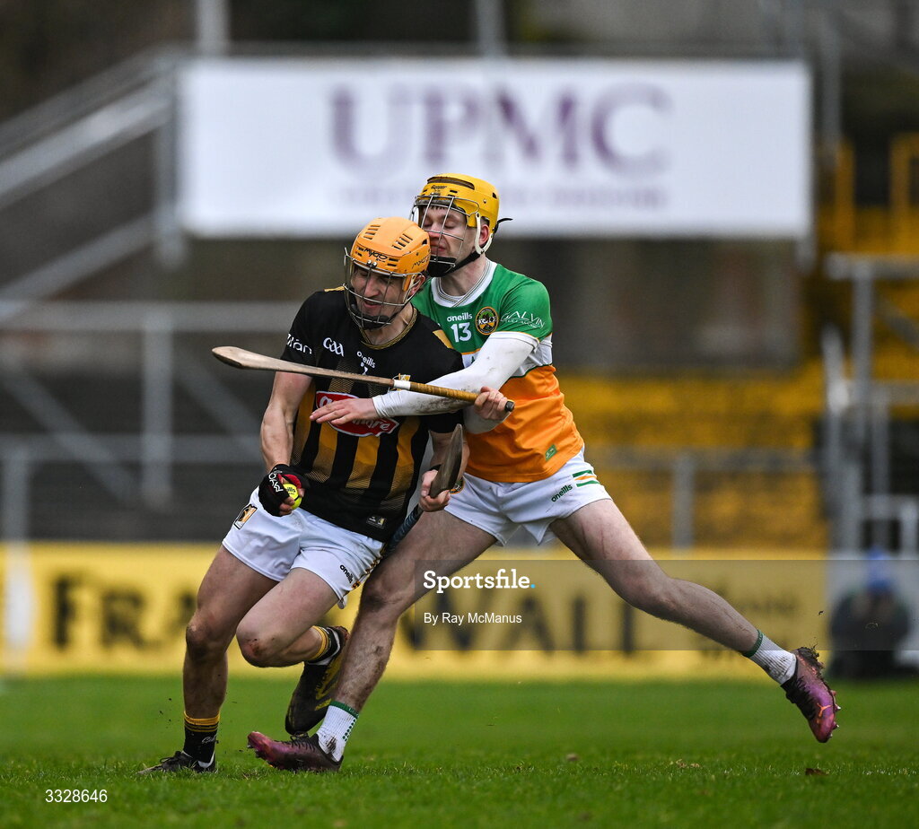 25 January 2026; Shane Murphy of Kilkenny is tackled by Brecon Kavanagh of Offaly during the Allianz Hurling League Division 1A match between Kilkenny and Offaly at UPMC Nowlan Park in Kilkenny. Photo by Ray McManus/Sportsfile