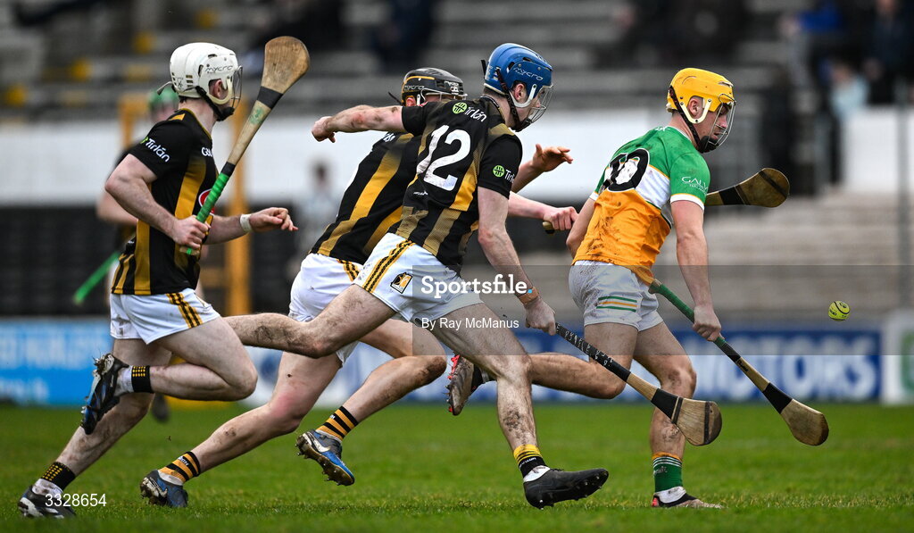 25 January 2026; Conor Doyle of Offaly races clear of Kilkenny players, Cathal Beirne, Sarragh Corcoran and Jordan Molloy in persuit during the Allianz Hurling League Division 1A match between Kilkenny and Offaly at UPMC Nowlan Park in Kilkenny. Photo by Ray McManus/Sportsfile