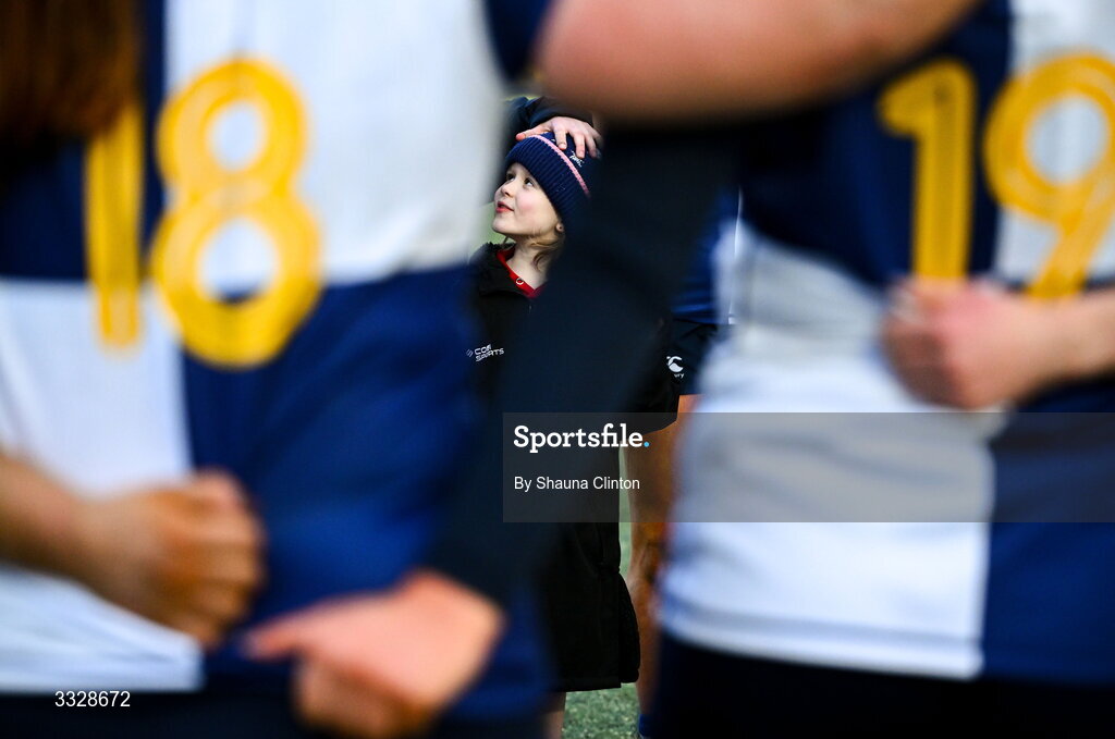 25 January 2026; Ellie Martin, centre, daughter of Wolfhounds assistant coach Ben Martin, joins Wolfounds players in a huddle after their side's victory in the Celtic Challenge Round 5 match between Wolfhounds and Glasgow Warriors at Virgin Media Park in Cork. Photo by Shauna Clinton/Sportsfile