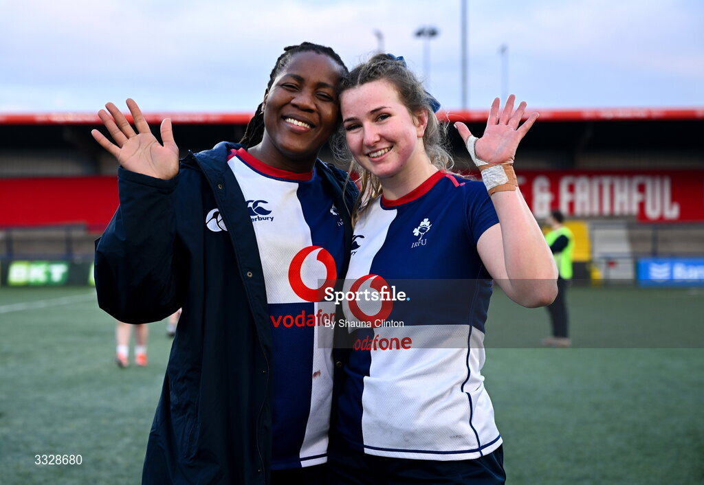 25 January 2026;Wolfhounds players Linda Djougang, left, and Aoife Corcoran celebrate after their side's victory in the Celtic Challenge Round 5 match between Wolfhounds and Glasgow Warriors at Virgin Media Park in Cork. Photo by Shauna Clinton/Sportsfile