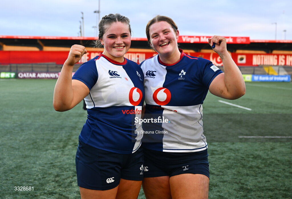 25 January 2026; Wolfhounds players Cara McLean, left, and Sophie Barrett celebrate after their side's victory in the Celtic Challenge Round 5 match between Wolfhounds and Glasgow Warriors at Virgin Media Park in Cork. Photo by Shauna Clinton/Sportsfile