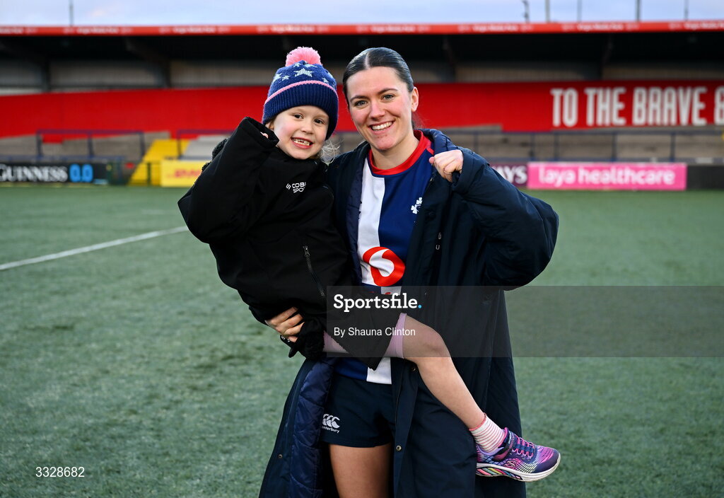 25 January 2026; Jade Gaffney of Wolfhounds, right, and Ellie Martin, daughter of Wolfhounds assistant coach Ben Martin, celebrate after their side's victory in the Celtic Challenge Round 5 match between Wolfhounds and Glasgow Warriors at Virgin Media Park in Cork. Photo by Shauna Clinton/Sportsfile