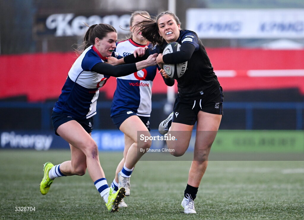25 January 2026; Poppy Mellanby of Glasgow Warriors is tackled by Kate Farrell McCabe of Wolfounds during the Celtic Challenge Round 5 match between Wolfhounds and Glasgow Warriors at Virgin Media Park in Cork. Photo by Shauna Clinton/Sportsfile