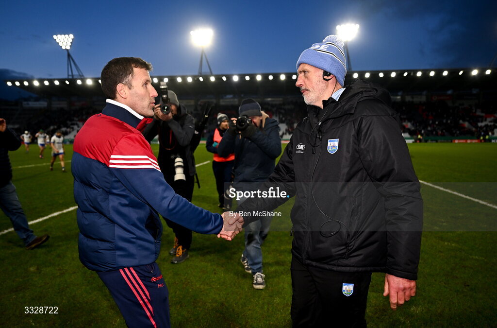 25 January 2026; Cork manager Ben O'Connor, left, and Waterford manager Peter Queally shake hands after the Allianz Hurling League Division 1A match between Cork and Waterford at SuperValu Páirc Uí Chaoimh in Cork. Photo by Ben McShane/Sportsfile