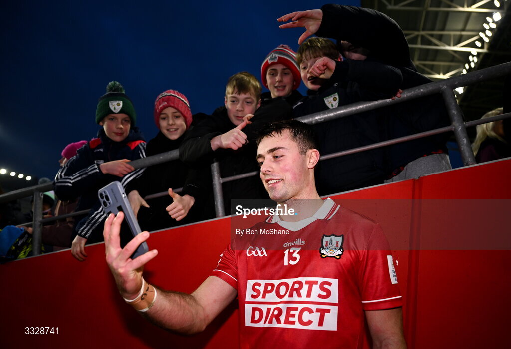 25 January 2026; William Buckley of Cork takes a selfie with supporters after the Allianz Hurling League Division 1A match between Cork and Waterford at SuperValu Páirc Uí Chaoimh in Cork. Photo by Ben McShane/Sportsfile