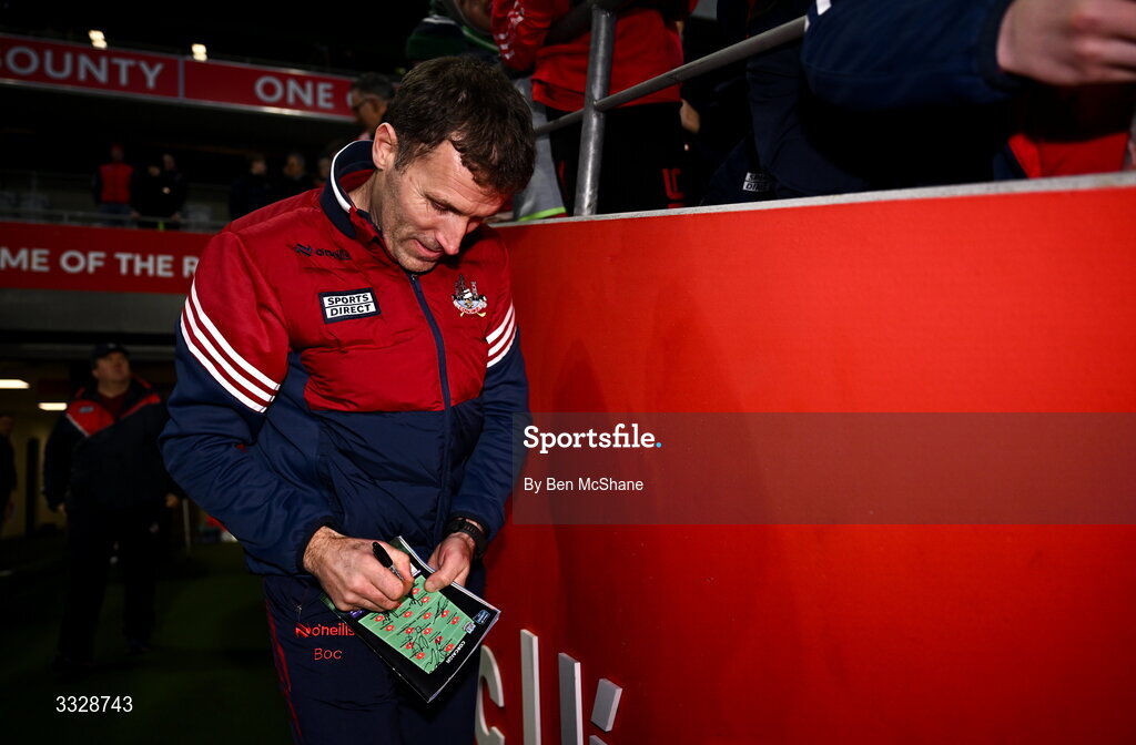 25 January 2026; Cork manager Ben O'Connor signs a programme after the Allianz Hurling League Division 1A match between Cork and Waterford at SuperValu Páirc Uí Chaoimh in Cork. Photo by Ben McShane/Sportsfile
