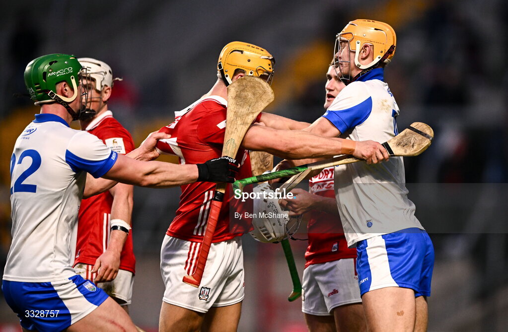 25 January 2026; Sean Walsh of Waterford and Micheál Mullins of Cork tussle during the Allianz Hurling League Division 1A match between Cork and Waterford at SuperValu Páirc Uí Chaoimh in Cork. Photo by Ben McShane/Sportsfile