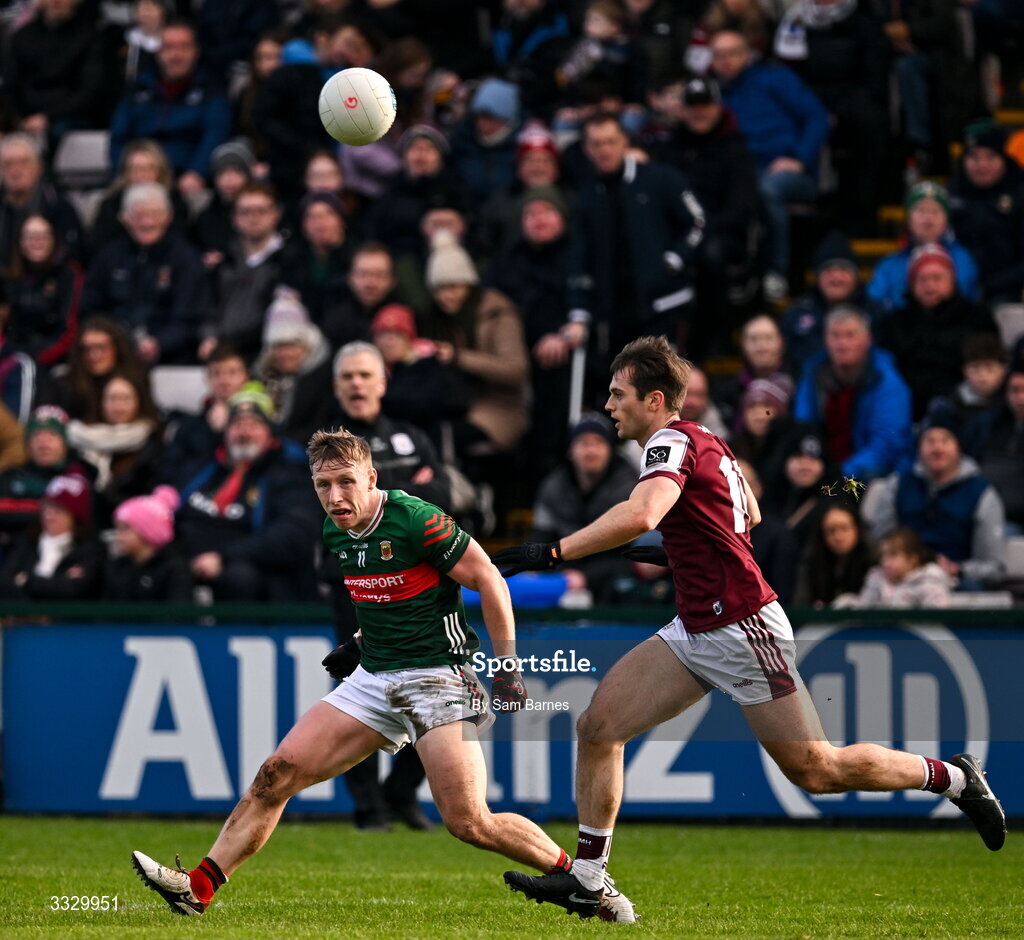 25 January 2026; Ryan O’Donoghue of Mayo in action against Liam Silke of Galway during the Allianz Football League Division 1 match between Galway and Mayo at Pearse Stadium in Galway. Photo by Sam Barnes/Sportsfile
