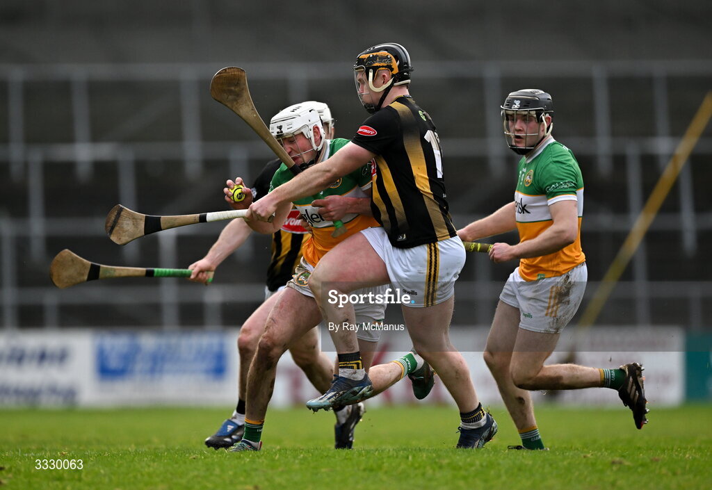 25 January 2026; Ross Ravenhill of Offaly is tackled by Gearóid Dunne of Kilkenny during the Allianz Hurling League Division 1A match between Kilkenny and Offaly at UPMC Nowlan Park in Kilkenny. Photo by Ray McManus/Sportsfile