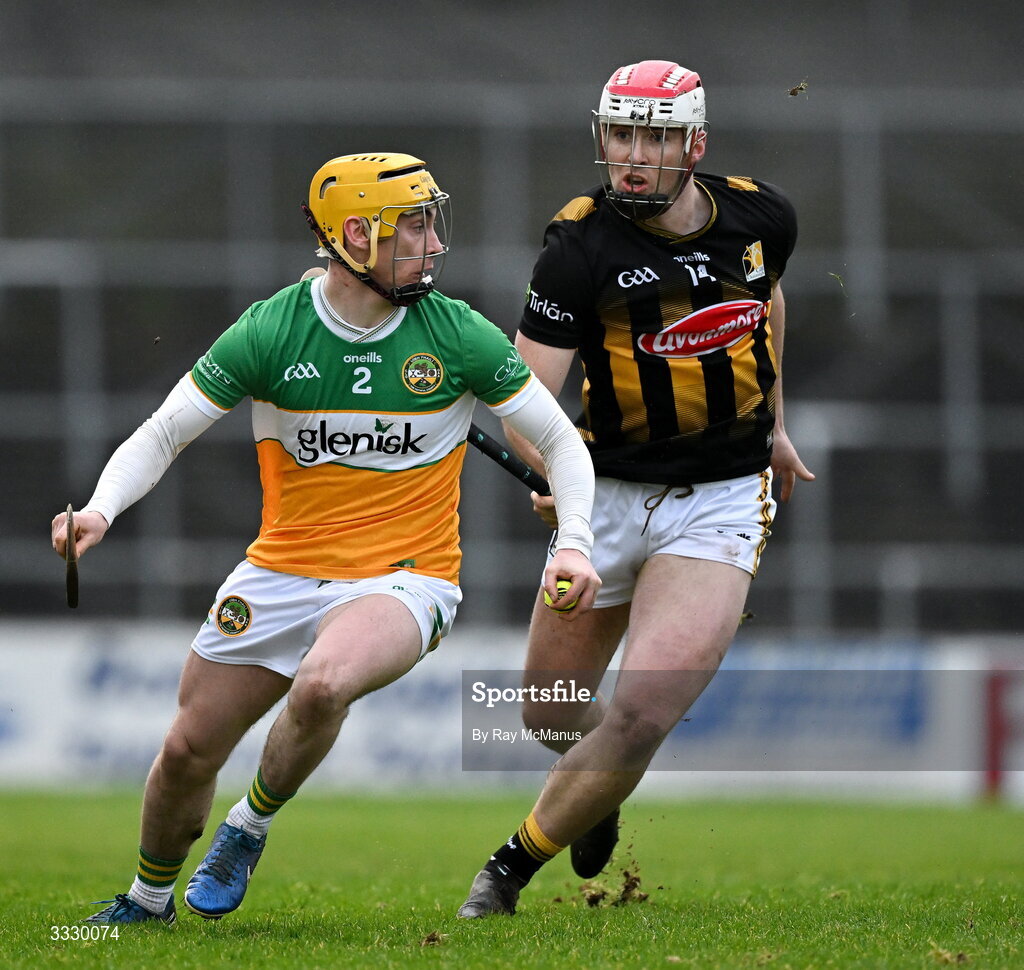 25 January 2026; Pat Taaffe of Offaly in action against Liam Moore of Kilkenny during the Allianz Hurling League Division 1A match between Kilkenny and Offaly at UPMC Nowlan Park in Kilkenny. Photo by Ray McManus/Sportsfile