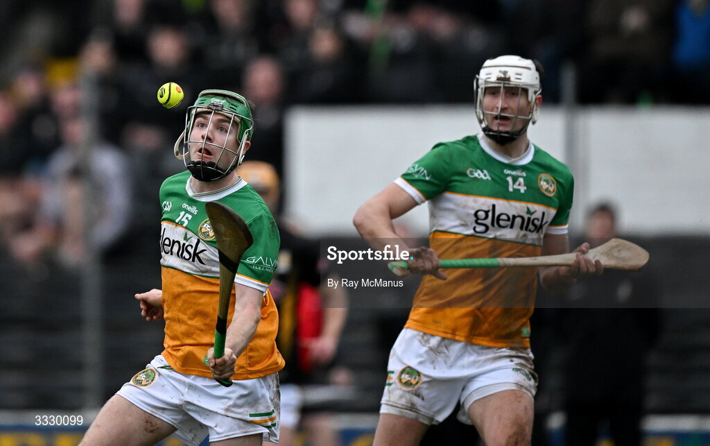 25 January 2026; Adam Screeney of Offaly, left, and Oisín Kelly during the Allianz Hurling League Division 1A match between Kilkenny and Offaly at UPMC Nowlan Park in Kilkenny. Photo by Ray McManus/Sportsfile