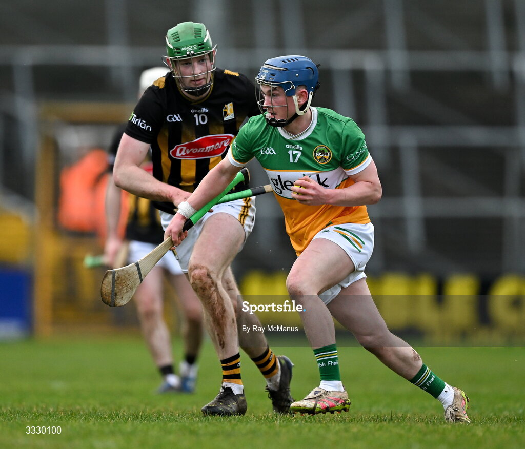25 January 2026; Colin Spain of Offaly is tackled by Luke Connellan of Kilkenny during the Allianz Hurling League Division 1A match between Kilkenny and Offaly at UPMC Nowlan Park in Kilkenny. Photo by Ray McManus/Sportsfile