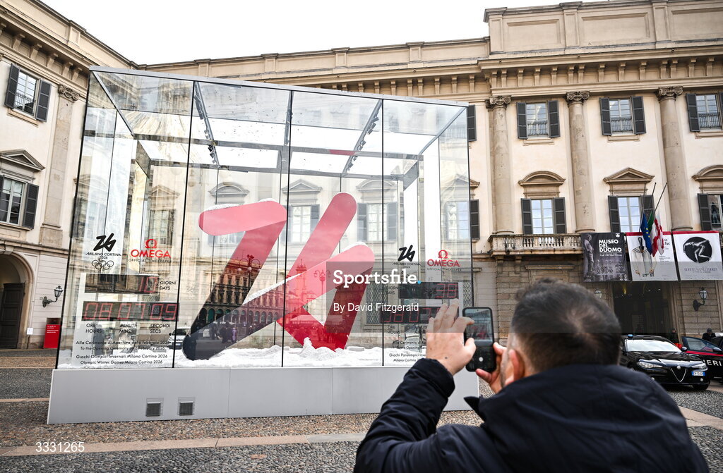 27 January 2026; A general view of the Omega Countdown Clock near Piazza Duomo ahead of the Milano Cortina 2026 Winter Olympics in Milan, Italy. Photo by David Fitzgerald/Sportsfile