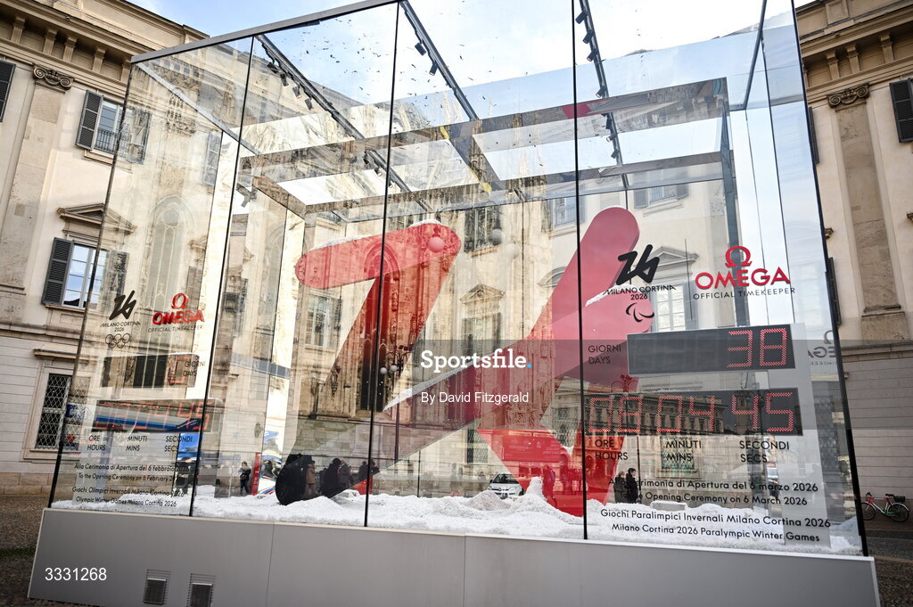 27 January 2026; A general view of the Omega Countdown Clock near Piazza Duomo ahead of the Milano Cortina 2026 Winter Olympics in Milan, Italy. Photo by David Fitzgerald/Sportsfile