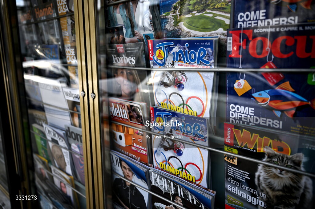 27 January 2026; A magazine stand is seen with winter olympics magazines in Porta Romana ahead of the Milano Cortina 2026 Winter Olympics in Milan, Italy. Photo by David Fitzgerald/Sportsfile