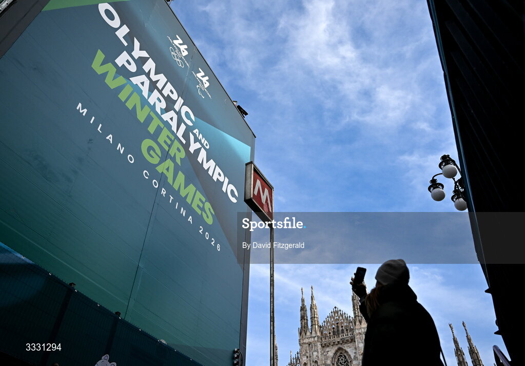 27 January 2026; Signage is seen in Piazza Duomo ahead of the Milano Cortina 2026 Winter Olympics in Milan, Italy. Photo by David Fitzgerald/Sportsfile