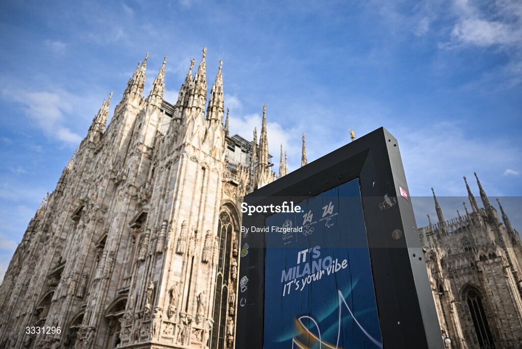 27 January 2026; Signage is seen in Piazza Duomo ahead of the Milano Cortina 2026 Winter Olympics in Milan, Italy. Photo by David Fitzgerald/Sportsfile