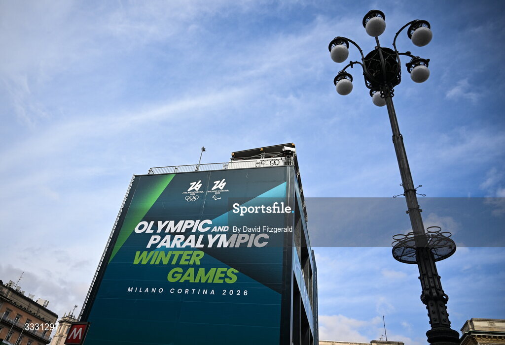 27 January 2026; Signage is seen in Piazza Duomo ahead of the Milano Cortina 2026 Winter Olympics in Milan, Italy. Photo by David Fitzgerald/Sportsfile