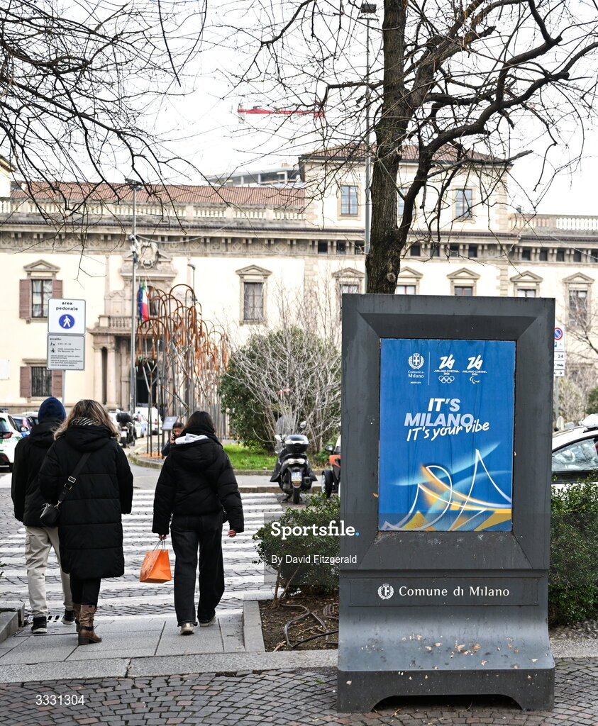 27 January 2026; Signage is seen near Piazza Duomo ahead of the Milano Cortina 2026 Winter Olympics in Milan, Italy. Photo by David Fitzgerald/Sportsfile