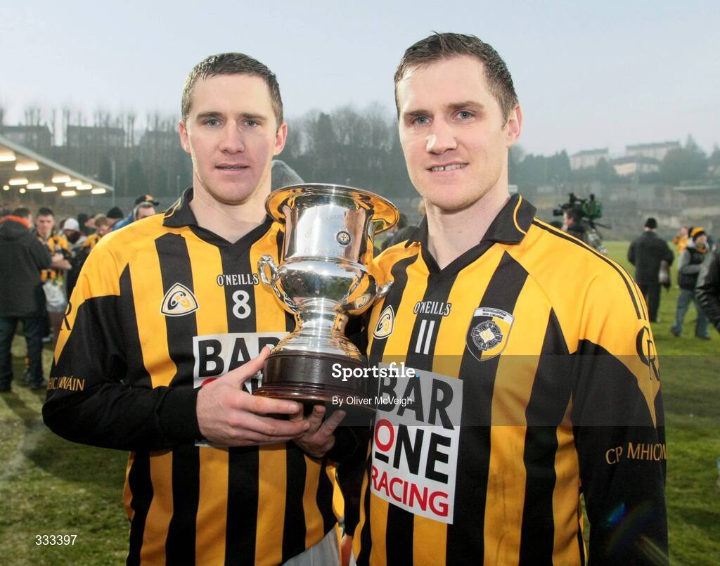 14 December 2008; Crossmaglen Rangers' Tony McEntee and John McEntee with the Seamus McFerran cup. AIB Ulster Senior Club Football Championship Final Replay, Crossmaglen Rangers v Ballinderry, Brewster Park, Enniskillen, Co. Fermanagh. Picture credit: Oliver McVeigh / SPORTSFILE