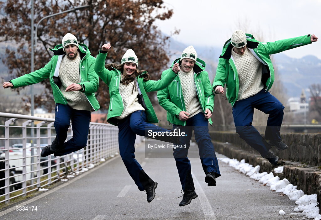 29 January 2026; Team Ireland athletes, from left, cross-country skiier Thomas Maloney Westgaard, alpine skiiers Anabelle Zurbay and Cormac Comerford and freestyle half-pipe skiier Ben Lynch during the Milano Cortina 2026 content capture day ahead of the Winter Olympic Games in Bolzano, Italy. Photo by David Fitzgerald/Sportsfile