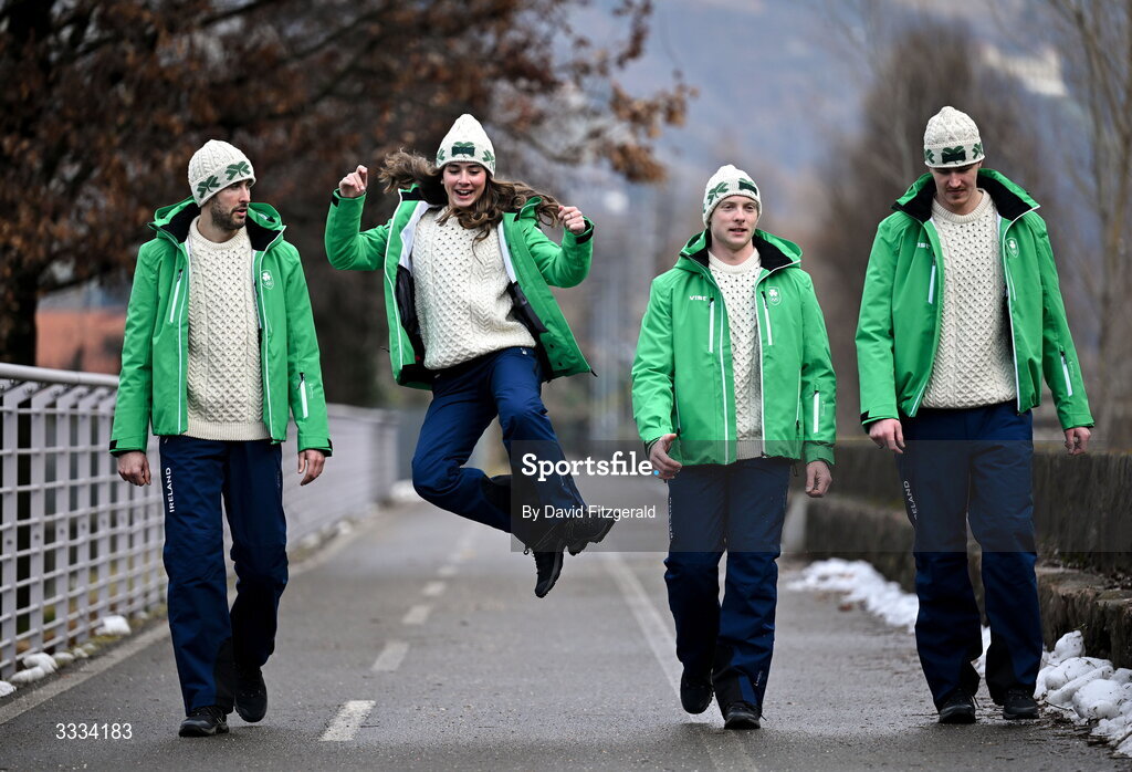 29 January 2026; Team Ireland athletes, from left, cross-country skiier Thomas Maloney Westgaard, alpine skiiers Anabelle Zurbay and Cormac Comerford and freestyle half-pipe skiier Ben Lynch during the Milano Cortina 2026 content capture day ahead of the Winter Olympic Games in Bolzano, Italy. Photo by David Fitzgerald/Sportsfile